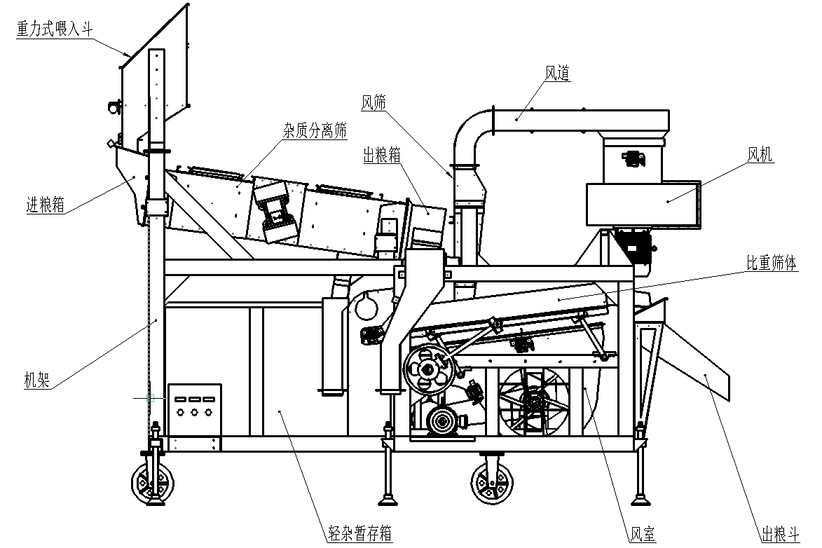 1.±¾»úÖ÷ÒªÓÉ»ú¼Ü¡¢É¢Á¸Ï䡢ɸѡ¡¢·çÑ¡¡¢±ÈÖØÊèɢ̨¡¢µç¿ØºÍÐÐ×ß×°Öõȼ¸²¿·Ö×é³É¡£